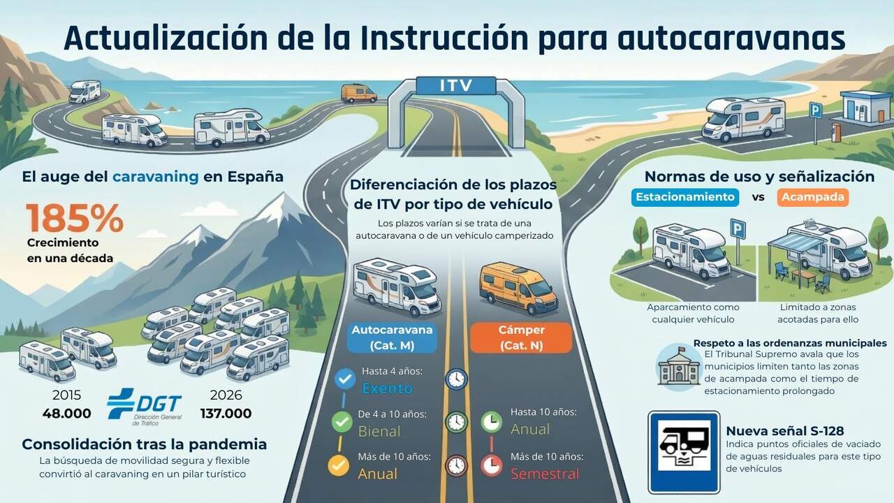 La Dirección General de Tráfico ha publicado una nueva instrucción, PROT 2026/04, que revisa la normativa previa de 2023. Este cambio no solo responde a la evolución legal, sino también a la creciente popularidad de las autocaravanas, que han visto un incremento notable en su número en los últimos años, especialmente tras la pandemia de Covid-19.